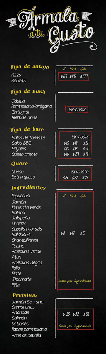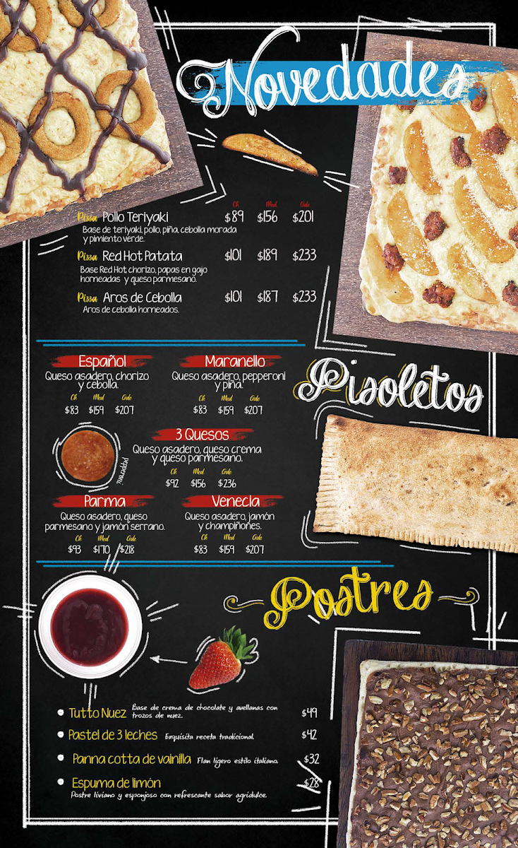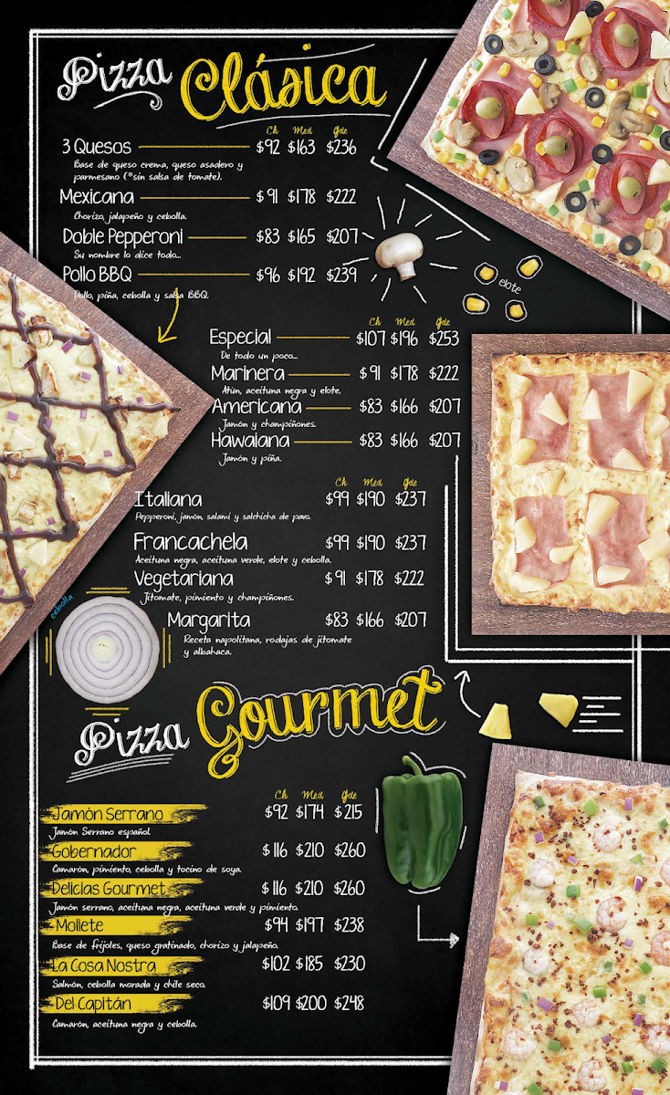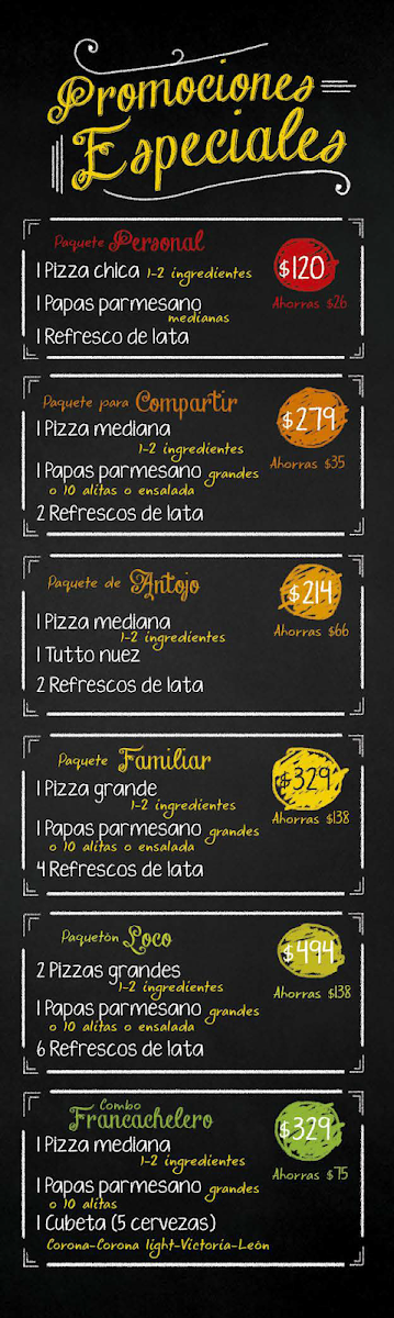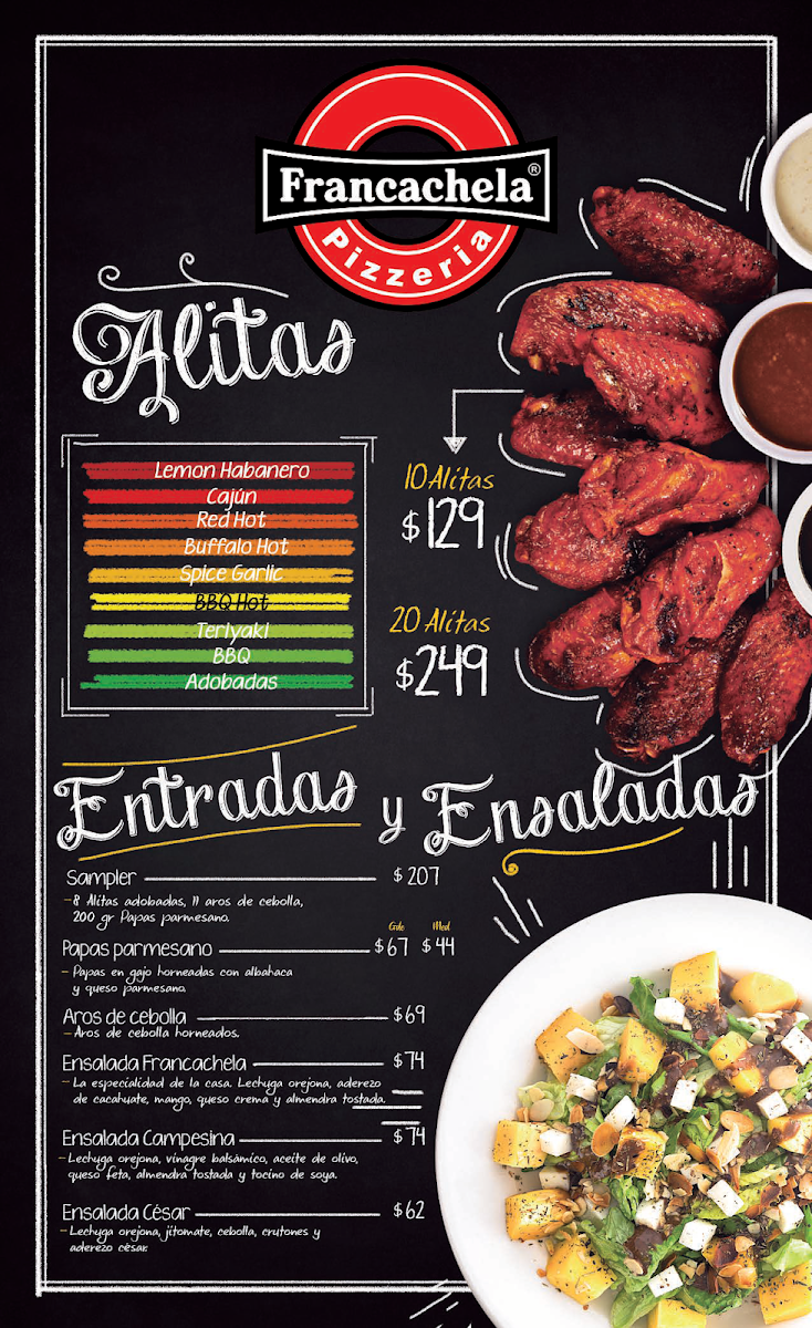 The menu at Francachela Galerias Las Torres offers a delightful variety of dishes catering to different tastes. Starting with Entradas, diners can enjoy dishes like Papas Parmesano, Sampler, and Aros De Cebolla, which promise a satisfying start to any meal. The pizza selection is extensive, featuring crowd-pleasers like Pizza La Costra Nostra, Pizza Francachela, Pizza Margarita, Pizza Vegetariana, and Pizza Italiana. For a lighter option, the restaurant offers refreshing Ensalada César, Ensalada Francachela, and Ensalada Campesina. If you're in the mood for something crispy, the Alitas come in two sizes, with options for 20 Alitas or 10 Alitas. The drinks menu includes basic yet refreshing choices like Refresco, Agua Embotellada, and Cerveza. For dessert, Tutto Nuez provides a sweet, nutty ending to the meal. The Promociones section offers a special deal with a Pizza Mediana Pepperoni A Precio Especial, perfect for those seeking a good bargain. Additionally, the Pisoletos come in a range of flavors, such as Pisoleto 3 Quesos, Pisoleto Parma, Pisoleto Español, Pisoleto Venecia, and Pisoleto Maranello, ensuring a variety of choices for those looking for something different from a classic pizza. Overall, the menu at Francachela Galerias Las Torres is diverse, catering to a wide range of preferences, all while providing comforting and delicious options at reasonable prices.